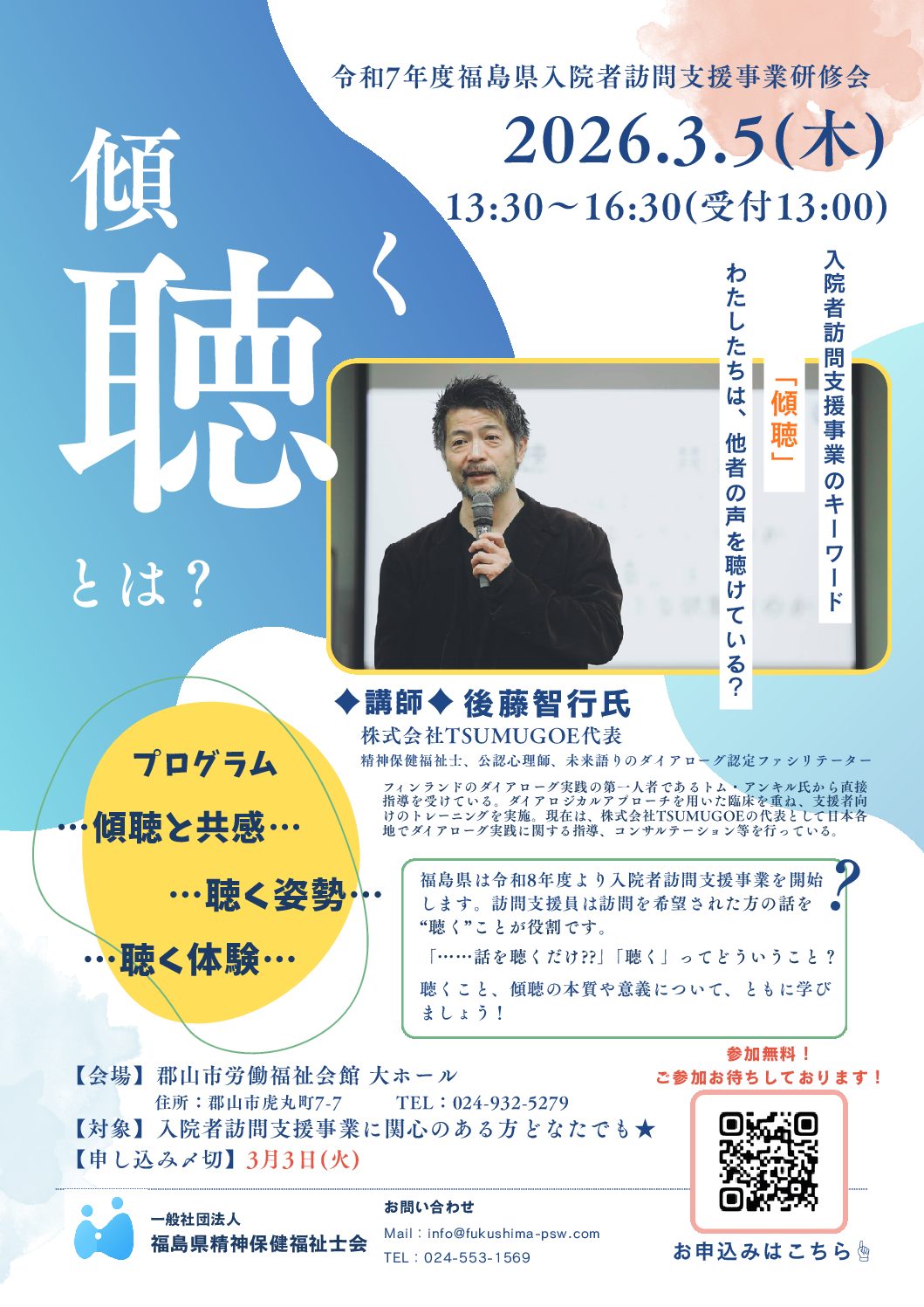 令和8年度より福島県内で入院者訪問支援事業を開始するにあたり、「聴く」「傾聴」を... 続きを読む